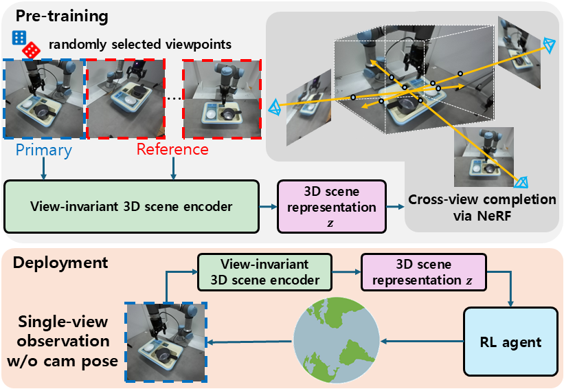 We propose a novel RL framework that extracts 3D-aware representations from single-view RGB input, without requiring camera pose or synchronized multi-view images during the downstream RL.